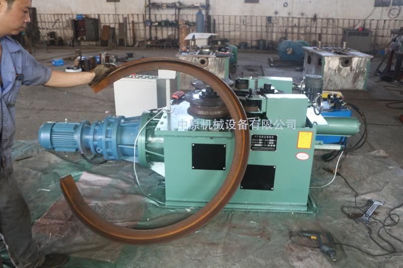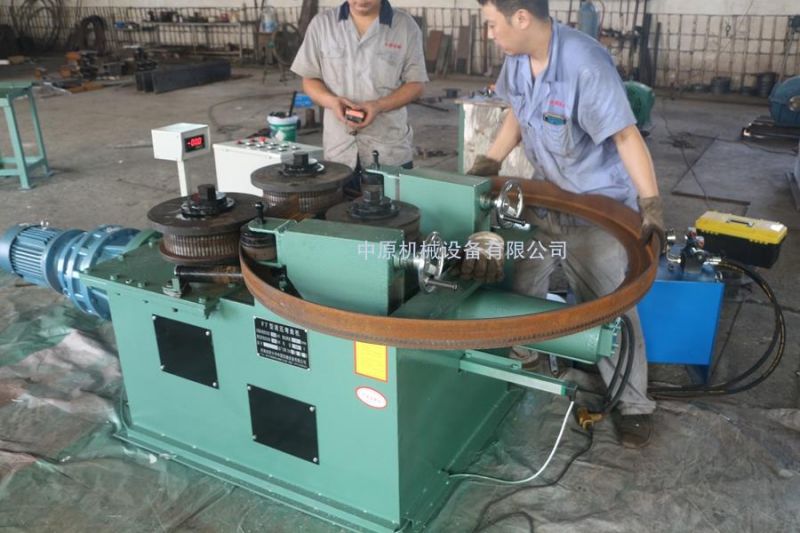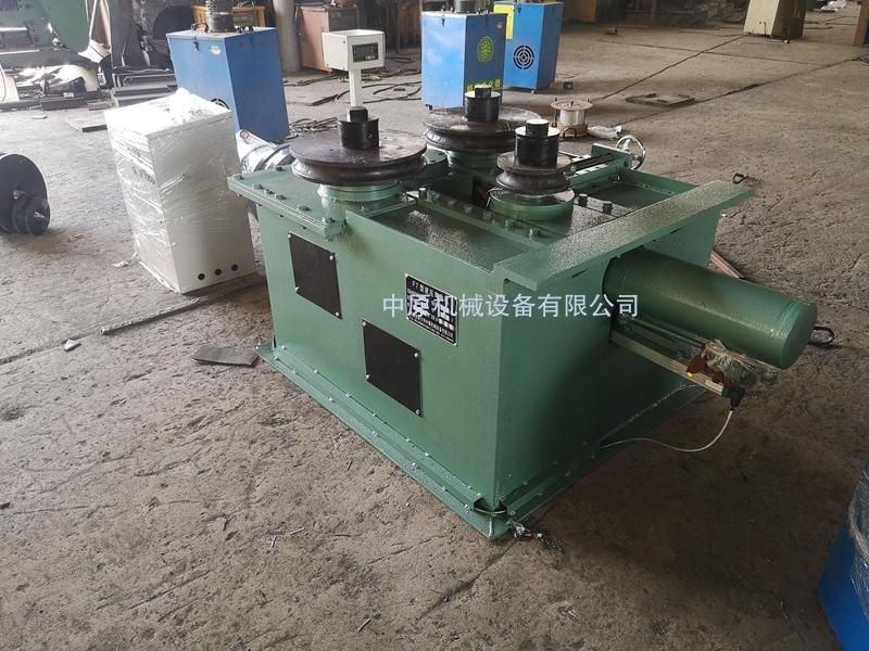 該機(jī)為叁輥型材卷圓機(jī),集機(jī)電一體。電機(jī)輸出的較高轉(zhuǎn)速通過傳動(dòng)裝置(聯(lián)軸器,減速機(jī),齒輪等)轉(zhuǎn)換成所需的大扭矩低轉(zhuǎn)速,帶動(dòng)固定位置的兩主動(dòng)輥實(shí)現(xiàn)旋轉(zhuǎn)運(yùn)動(dòng),為型材行走提供扭矩。被動(dòng)輥通過油缸前進(jìn)、后退實(shí)現(xiàn)位移,來控制直徑大小。三個(gè)工作輥成等腰三角形分布,通過調(diào)整移動(dòng)輥實(shí)現(xiàn)這三個(gè)點(diǎn)形成的弧線達(dá)到所需彎曲半徑,借助被動(dòng)輥的壓緊及兩主動(dòng)輥的旋轉(zhuǎn)運(yùn)動(dòng),使型材經(jīng)過多次連續(xù)彎曲,產(chǎn)生永久性塑性變形,用于常溫狀態(tài)下將型材卷制成圓形,弧形等工件。