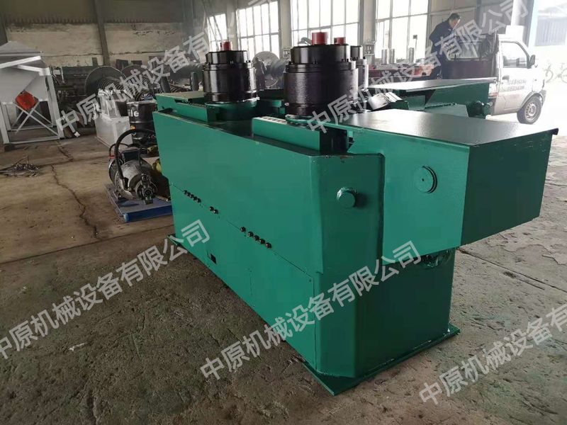 該機(jī)為叁輥型材卷圓機(jī),集機(jī)電一體。電機(jī)輸出的較高轉(zhuǎn)速通過傳動裝置(聯(lián)軸器,液壓馬達(dá),液壓油缸,齒輪等)轉(zhuǎn)換成所需的大扭矩低轉(zhuǎn)速,帶動兩主動輥實(shí)現(xiàn)旋轉(zhuǎn)運(yùn)動,為型材行走提供扭矩。兩個(gè)主動輥中心距可調(diào),被動輥通過液壓油缸前進(jìn)、后退實(shí)現(xiàn)位移,來控制直徑大小。三個(gè)工作輥成等腰三角形分布,通過調(diào)整移動輥實(shí)現(xiàn)這三個(gè)點(diǎn)形成的弧線達(dá)到所需彎曲半徑,借助被動輥的壓緊及兩主動輥的旋轉(zhuǎn)運(yùn)動,使型材經(jīng)過多次連續(xù)彎曲,產(chǎn)生永久性塑性變形,用于常溫狀態(tài)下將型材卷制成圓形,弧形等工件。